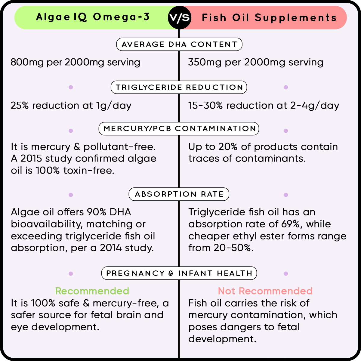| Pregnancy and Infant Health | RecommendNed daily intake during pregnancy is 200 mg of DHA. However, fish oil can carry the risk of mercury contamination, which poses dangers to fetal development. | 100% safe, mercury-free A safer alternative with the same recommended intake of 200-300 mg DHA per day for pregnant women. It is completely free of mercury, providing a safer source for fetal brain and eye development. |